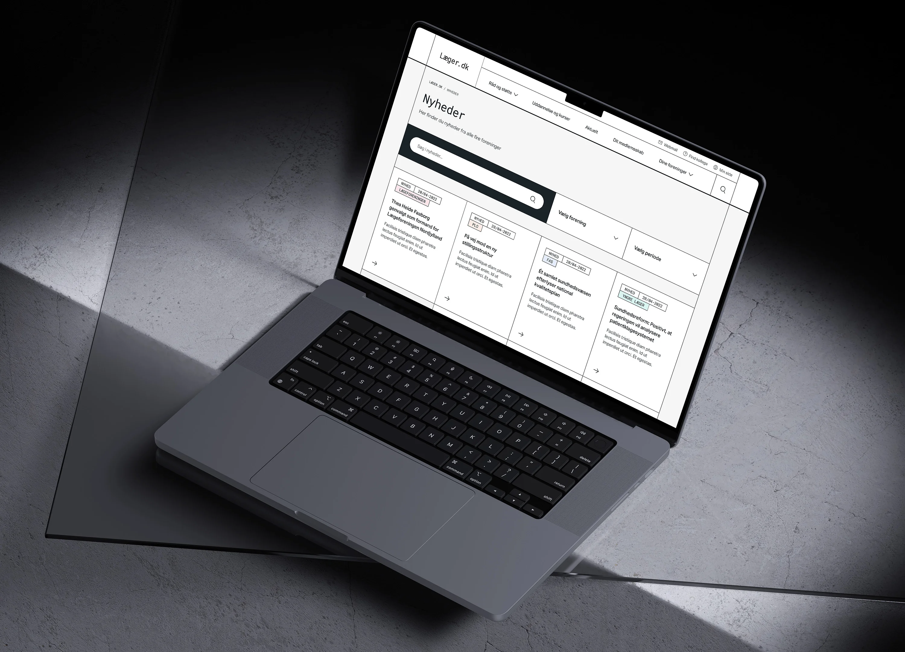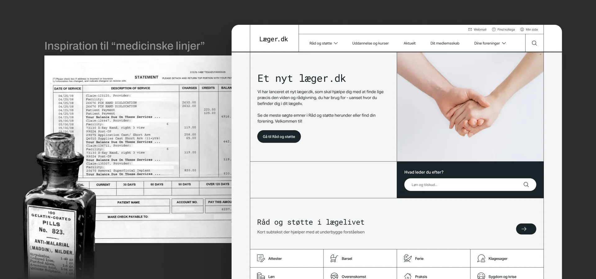 Konceptet er inspireret fra de karakteristiske medicinske linjer fra gamle recepter og labels og med et ønske om at skabe et fælles udtryk for de fire foreninger skabte vi en ny fælles monotone univers hvor de fire foreninger kan leve med hver deres særlige udtryk - Med omhyggeligt integrerede medicinske linjer og en ny mono typografi har vi skabt et visuelt udtryk, der både skiller sig ud og forbedrer funktionaliteten af websitet.